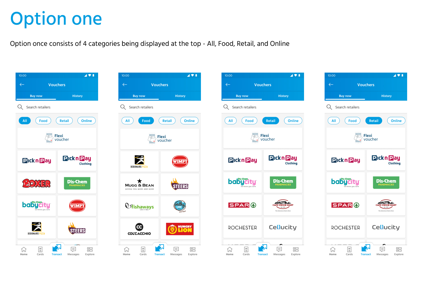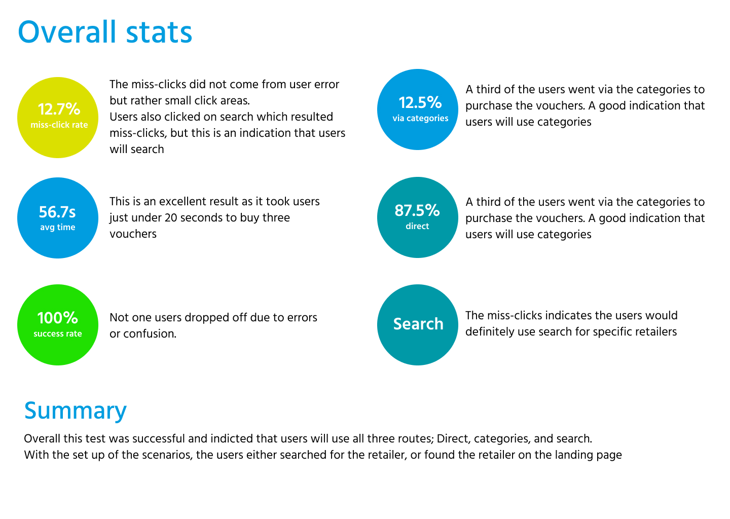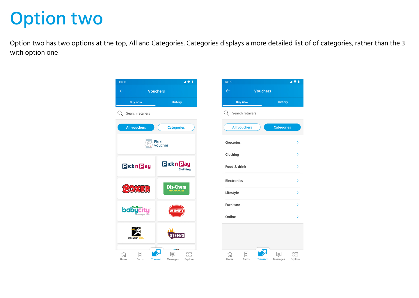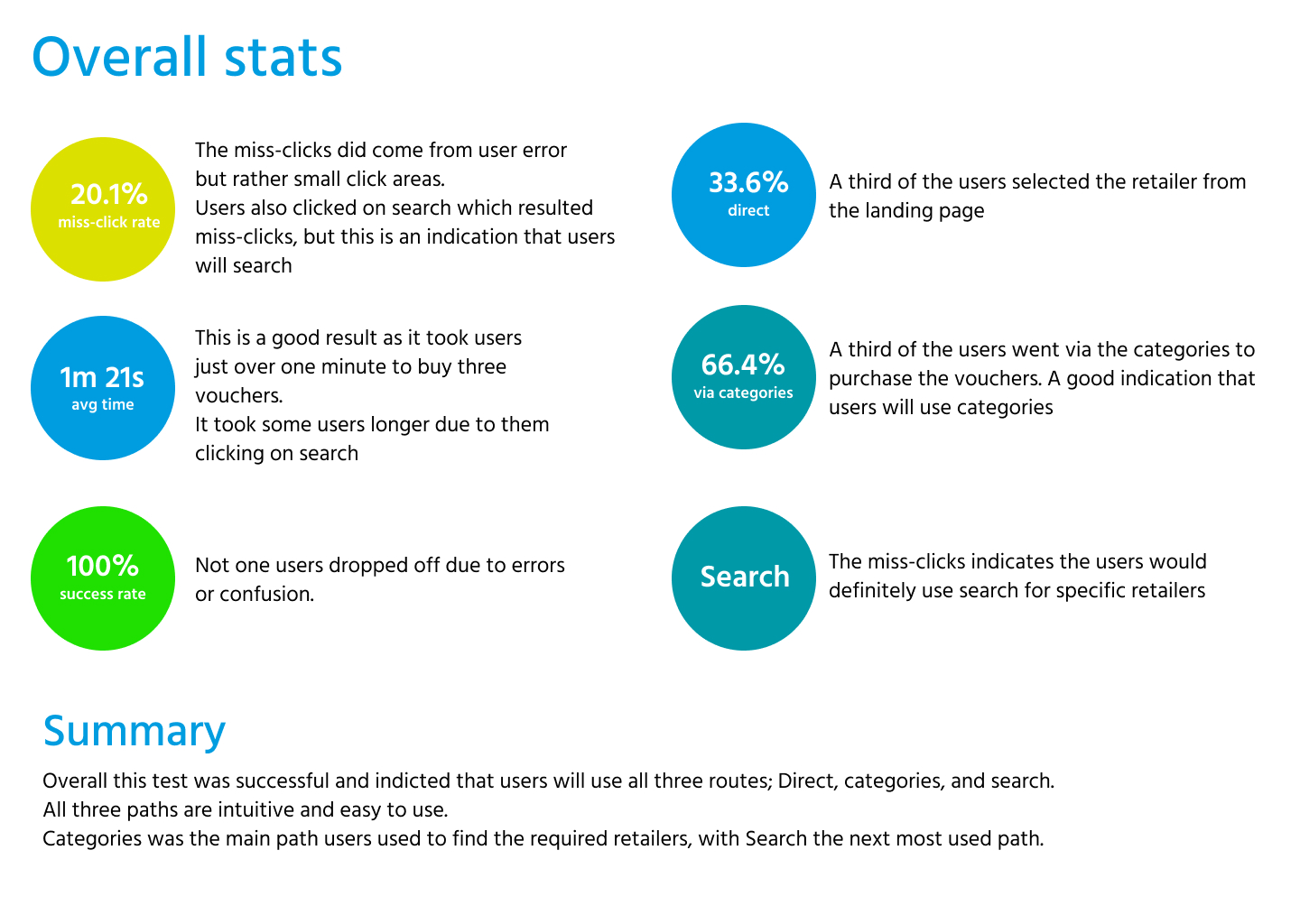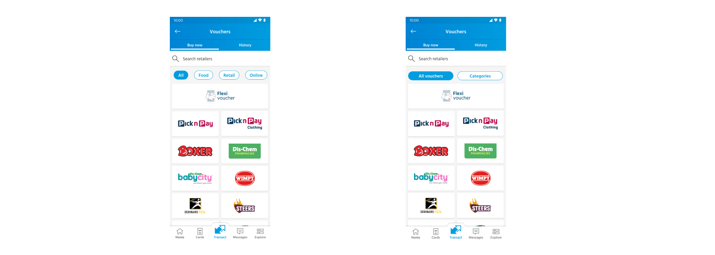 Option one features simple and easily understandable categories, allowing users to select the appropriate category to find their desired retailer. This design proved effective when users knew exactly what they were looking for, as it provided a clear and straightforward path to their desired voucher. On the other hand, option two included categories on a separate page, which were further divided into more detailed subcategories. This design encouraged users to utilize the landing page more frequently to explore and find specific retailers. Option two proved more suitable for users who wanted to browse available options before making a purchase.