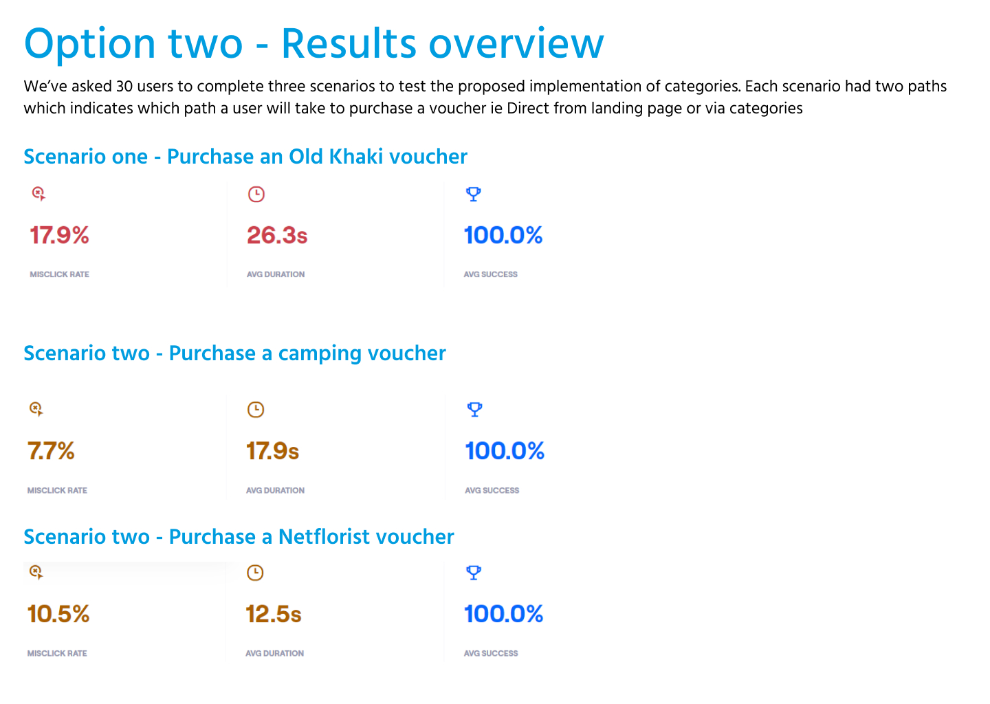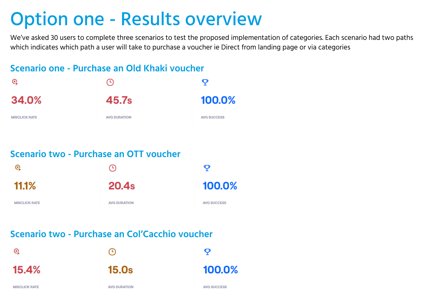 We set up two Maze tests, each with a different variation of how we will display categories. We sent out the test to 60 participants, 30 per option