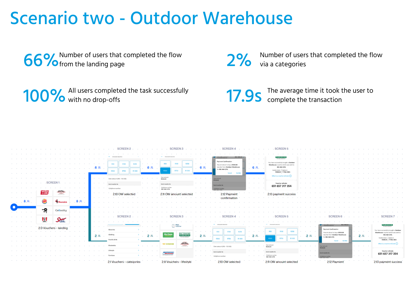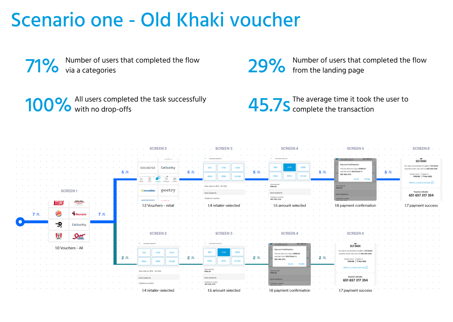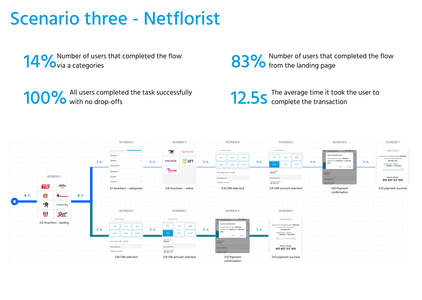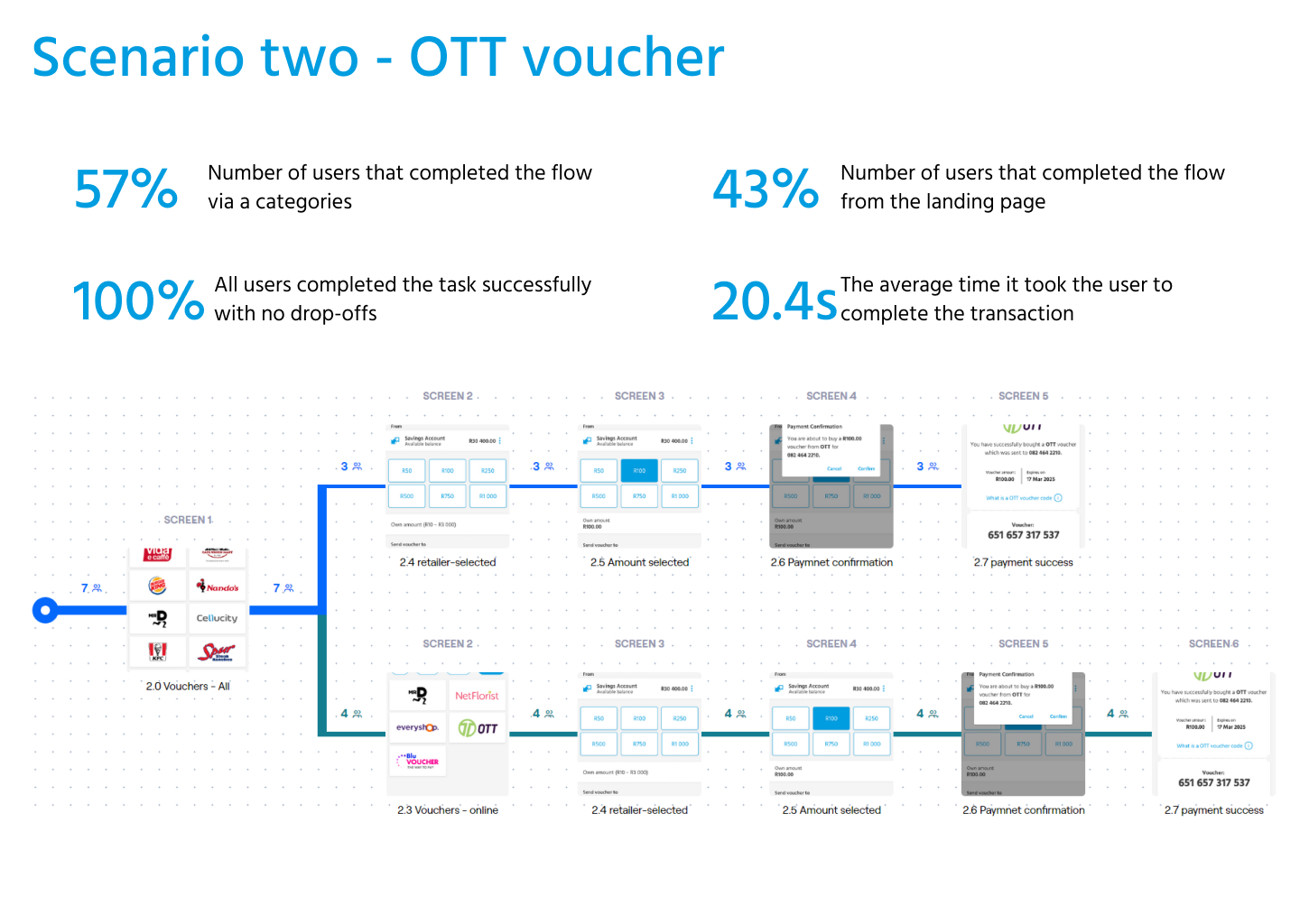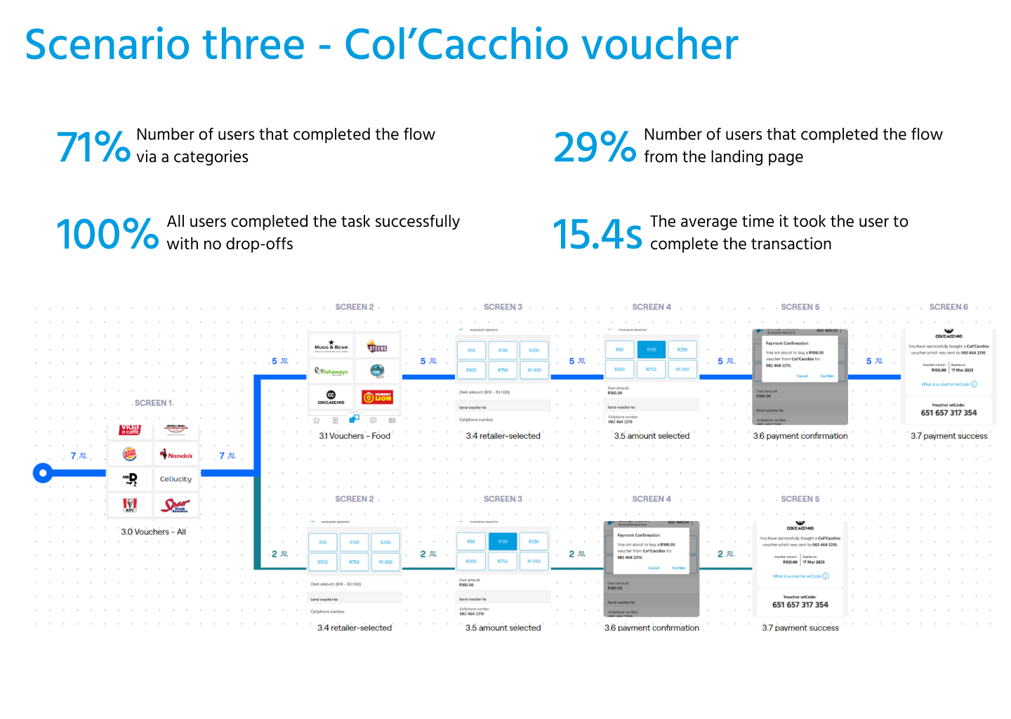 During the test, users were presented with three scenarios, each involving the purchase of different vouchers. For each scenario, two alternative paths were available, offering users different options to reach their end goal.
